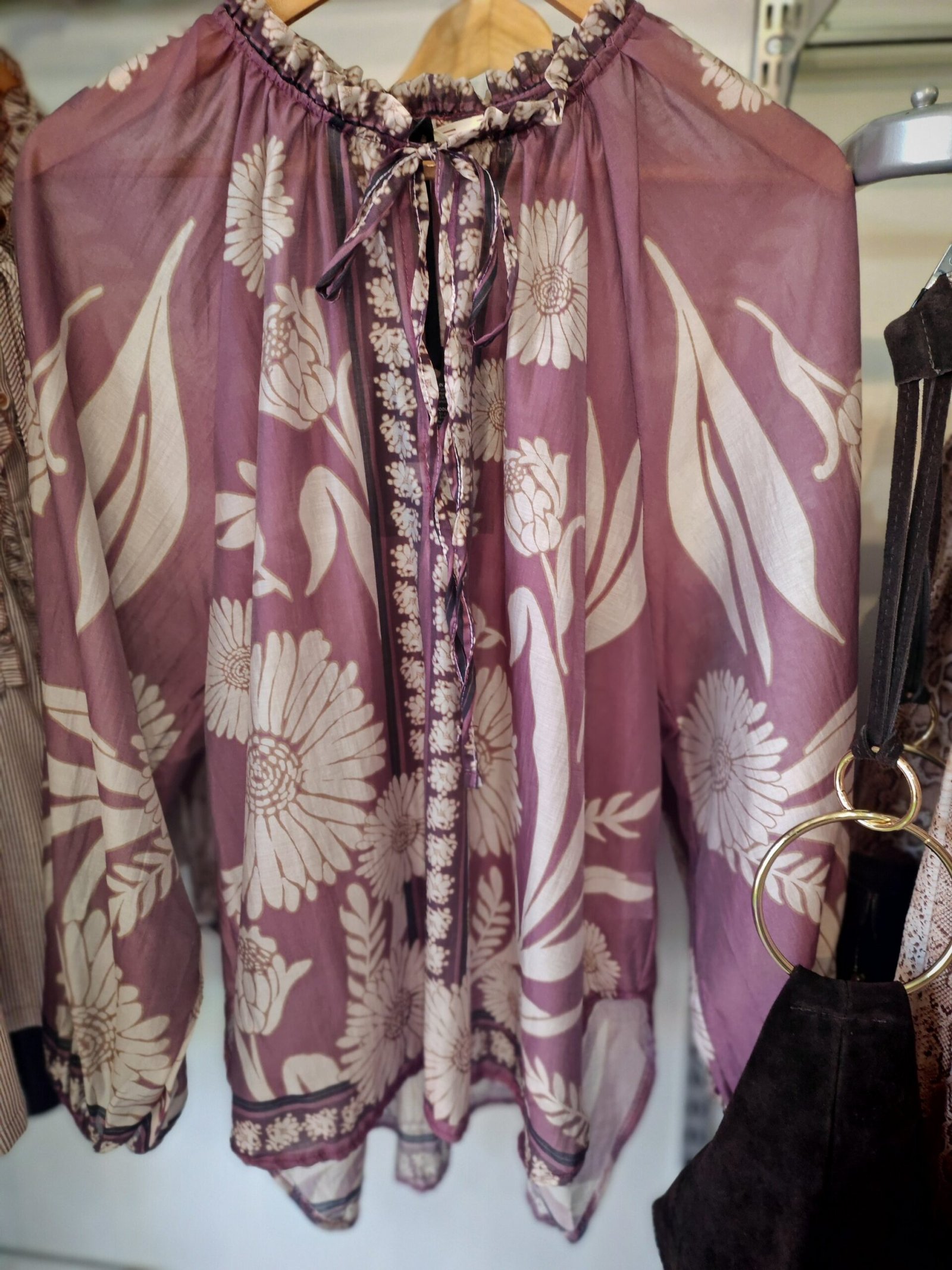 Tie neck and elasticated sleeve.