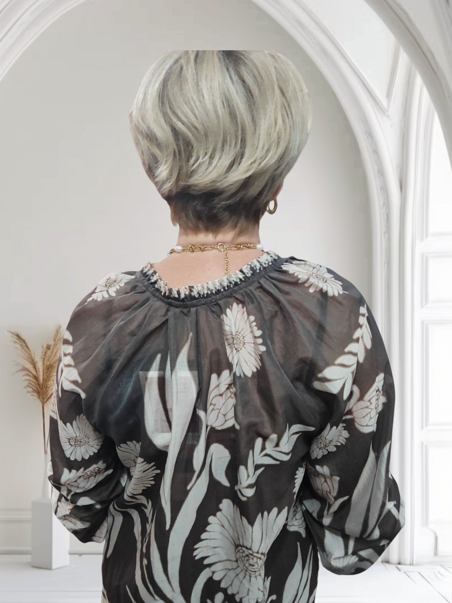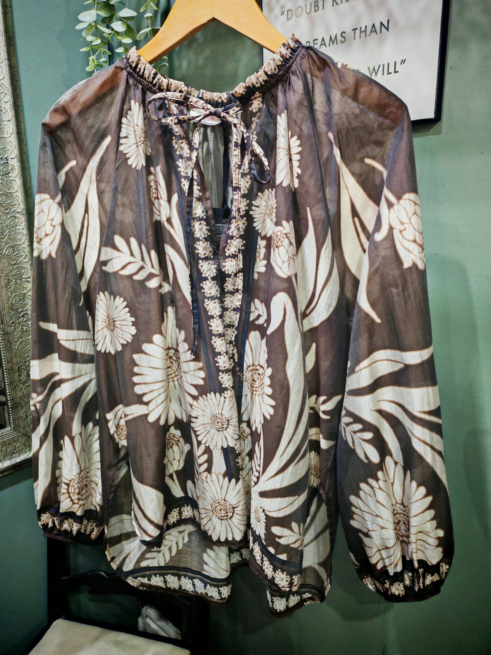 Tie neck and elasticated sleeve.