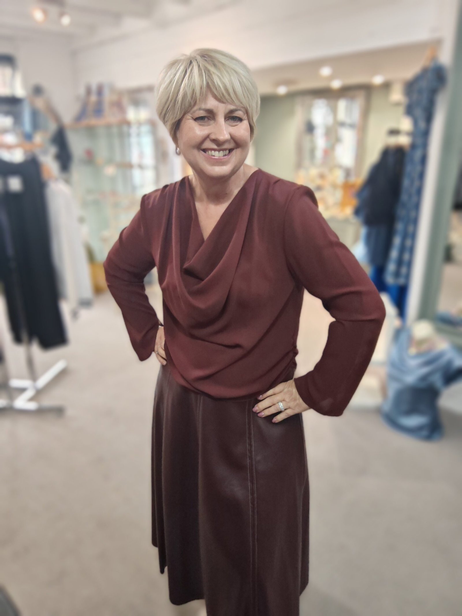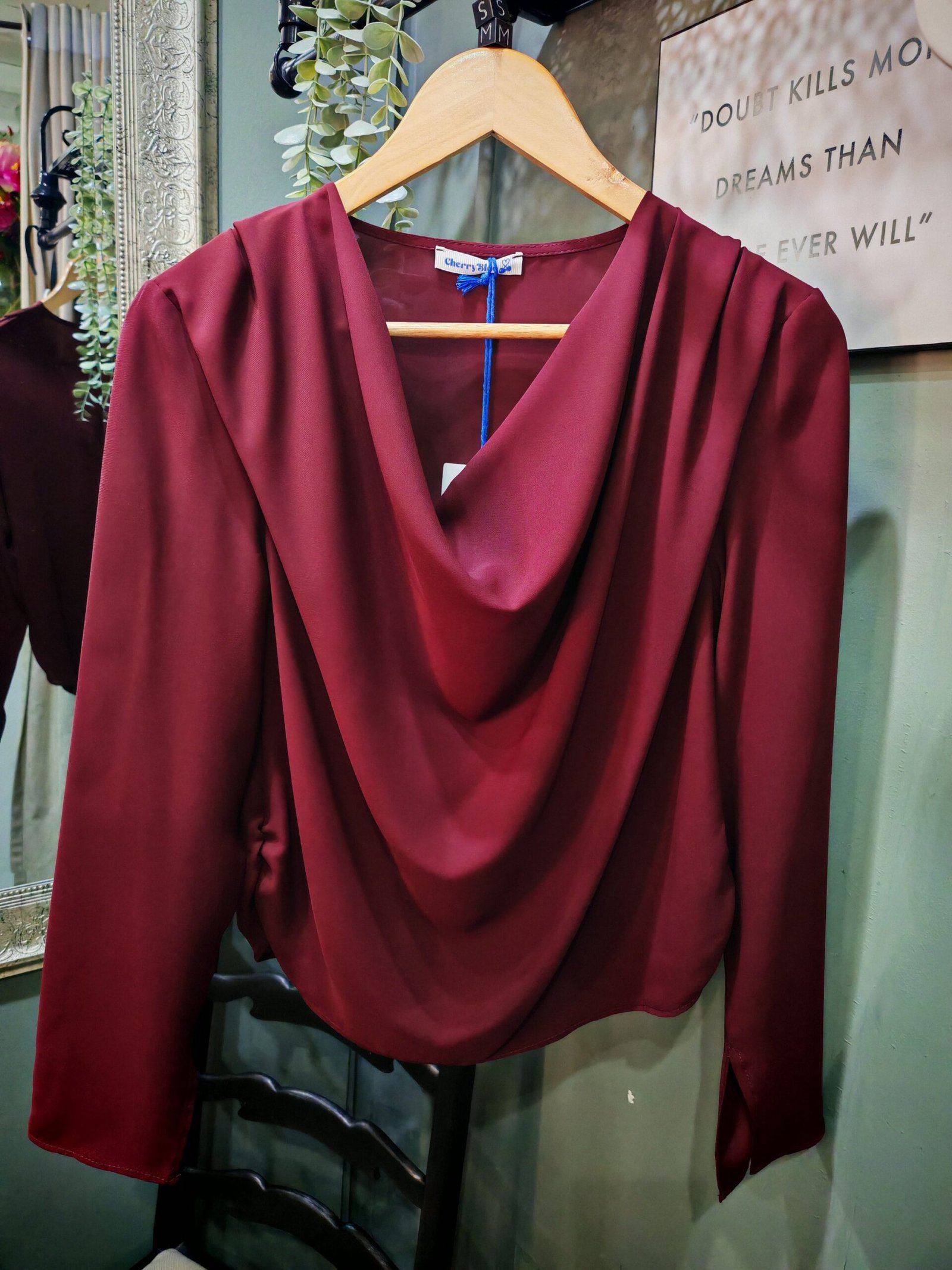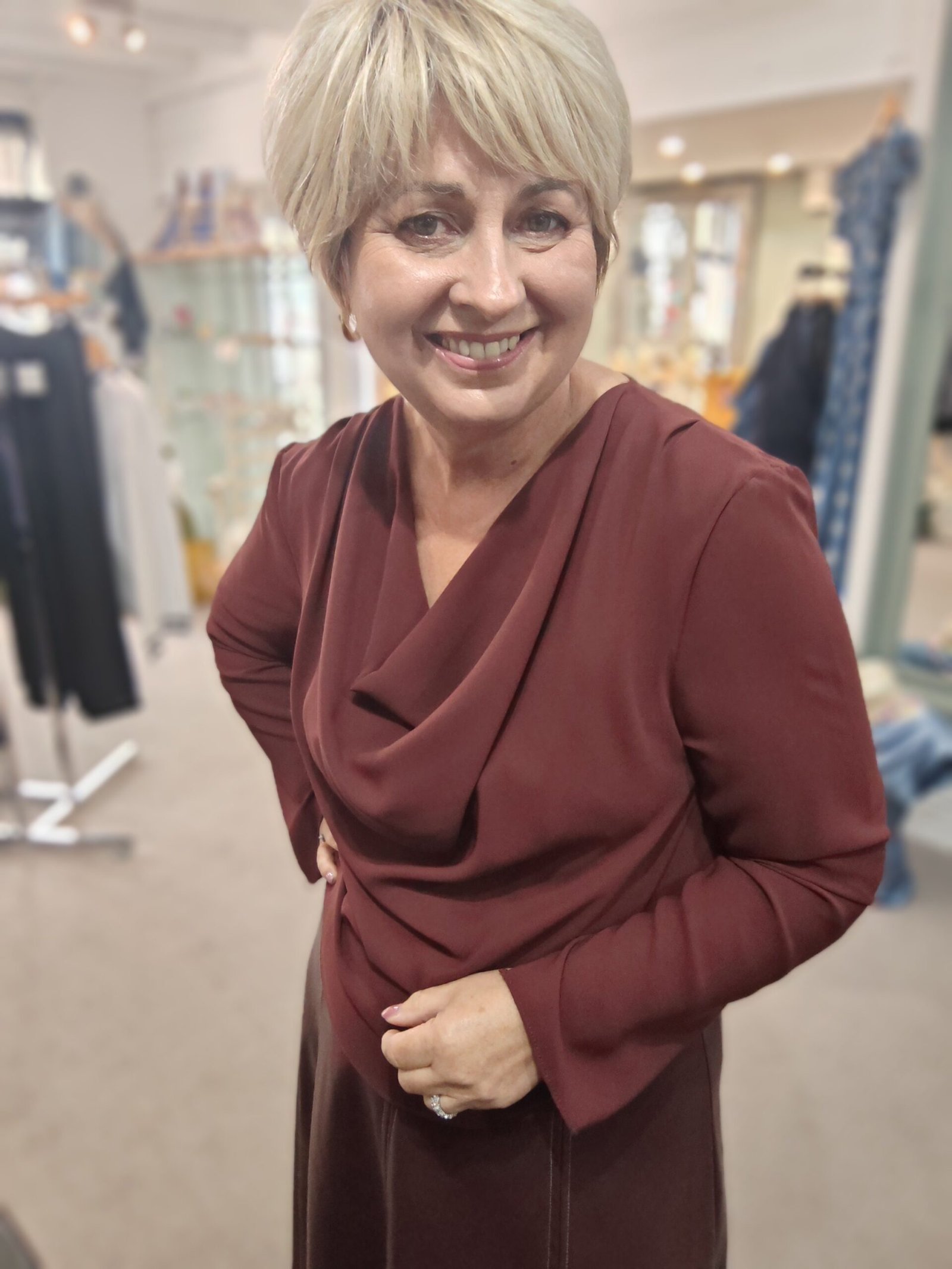 This silky feel shirt has a drape neckline which is perfect under a jacket or chunky knit. Roll up the arm and reveal the split sleeve detail of this lovely blouse. This season’s burgundy colour!