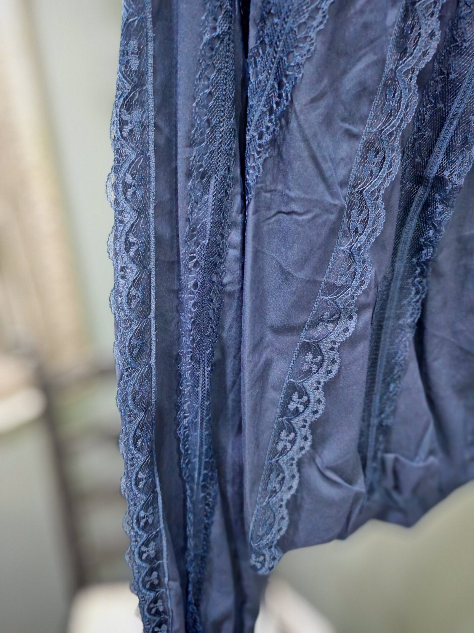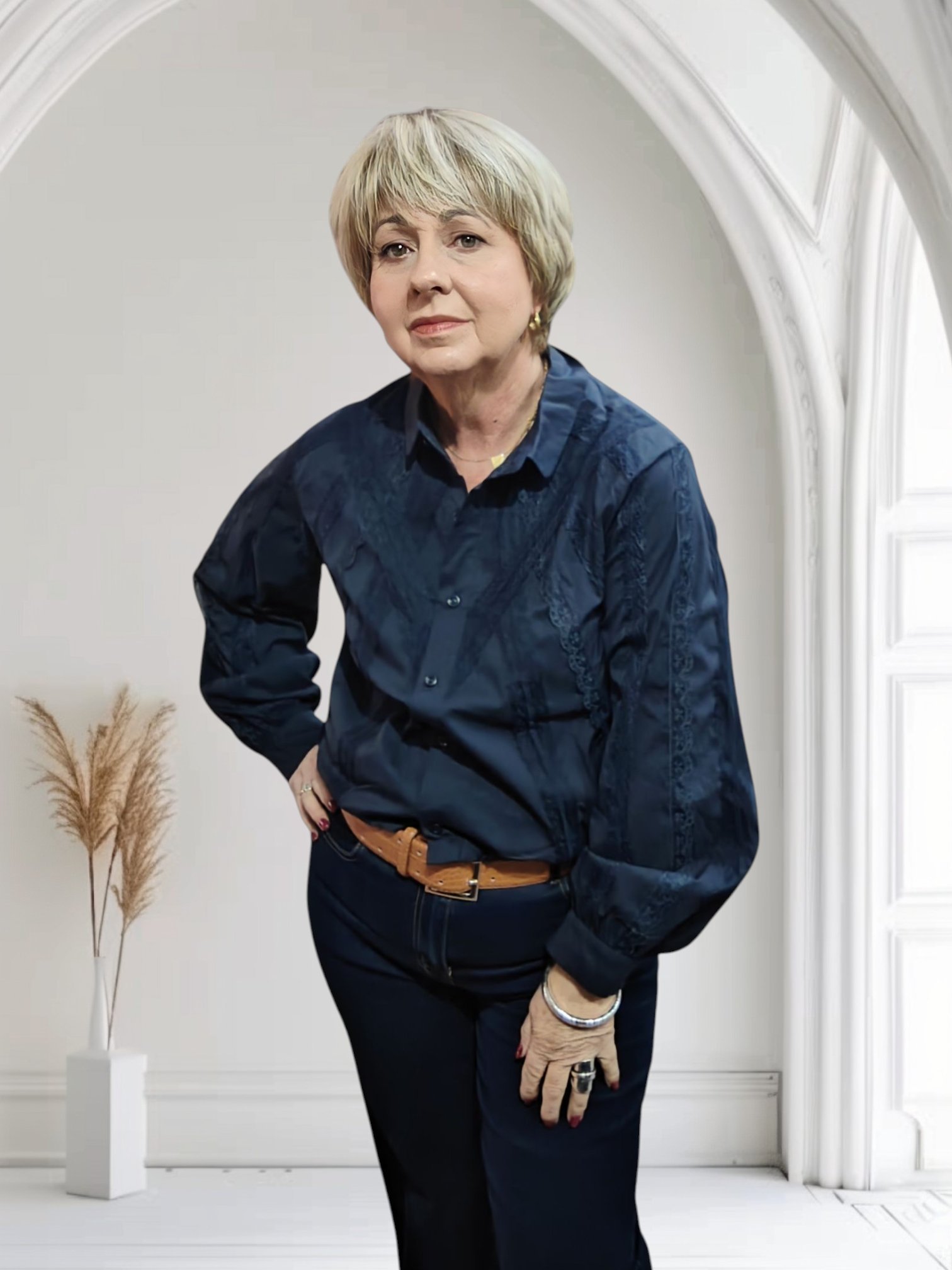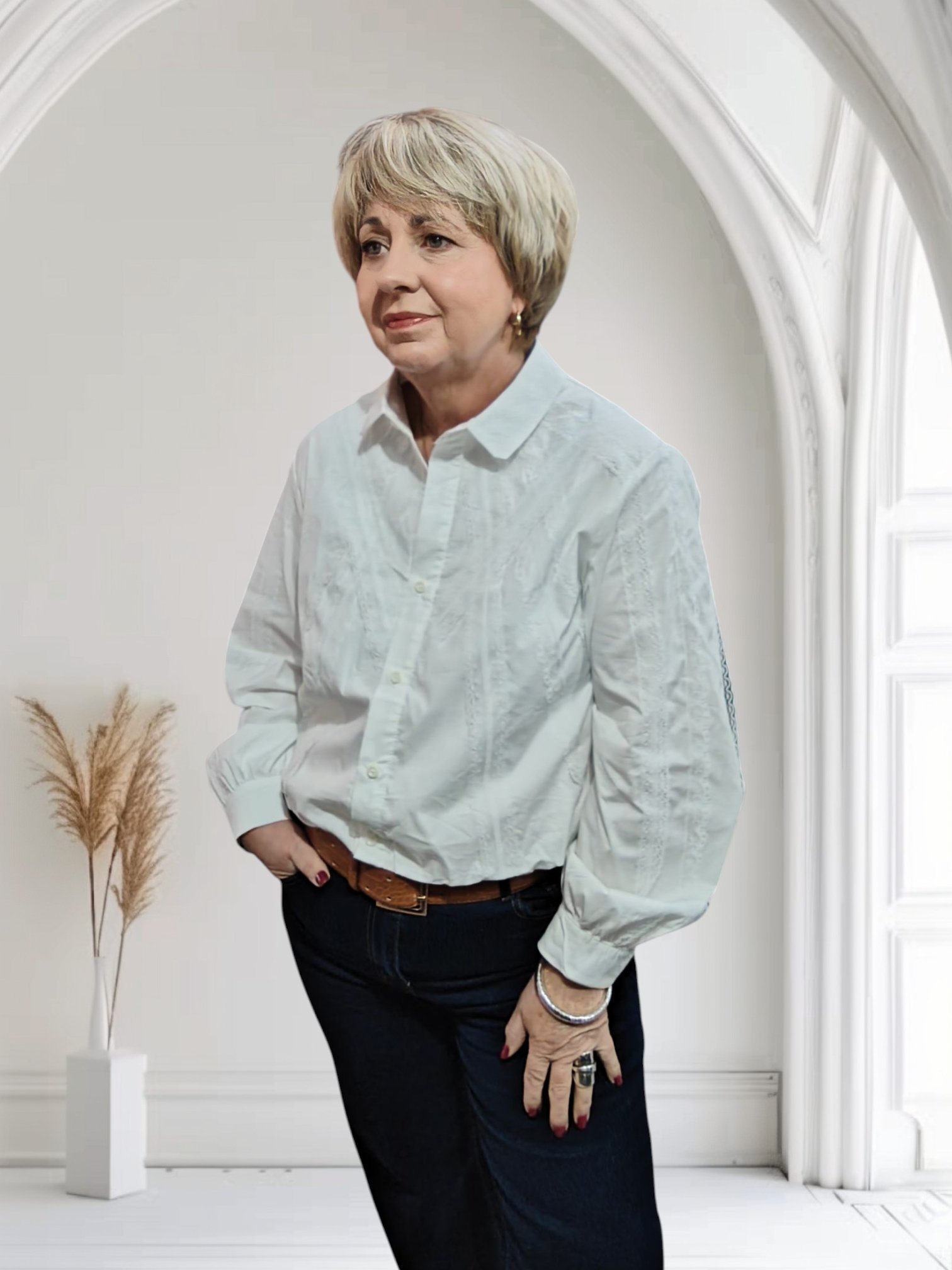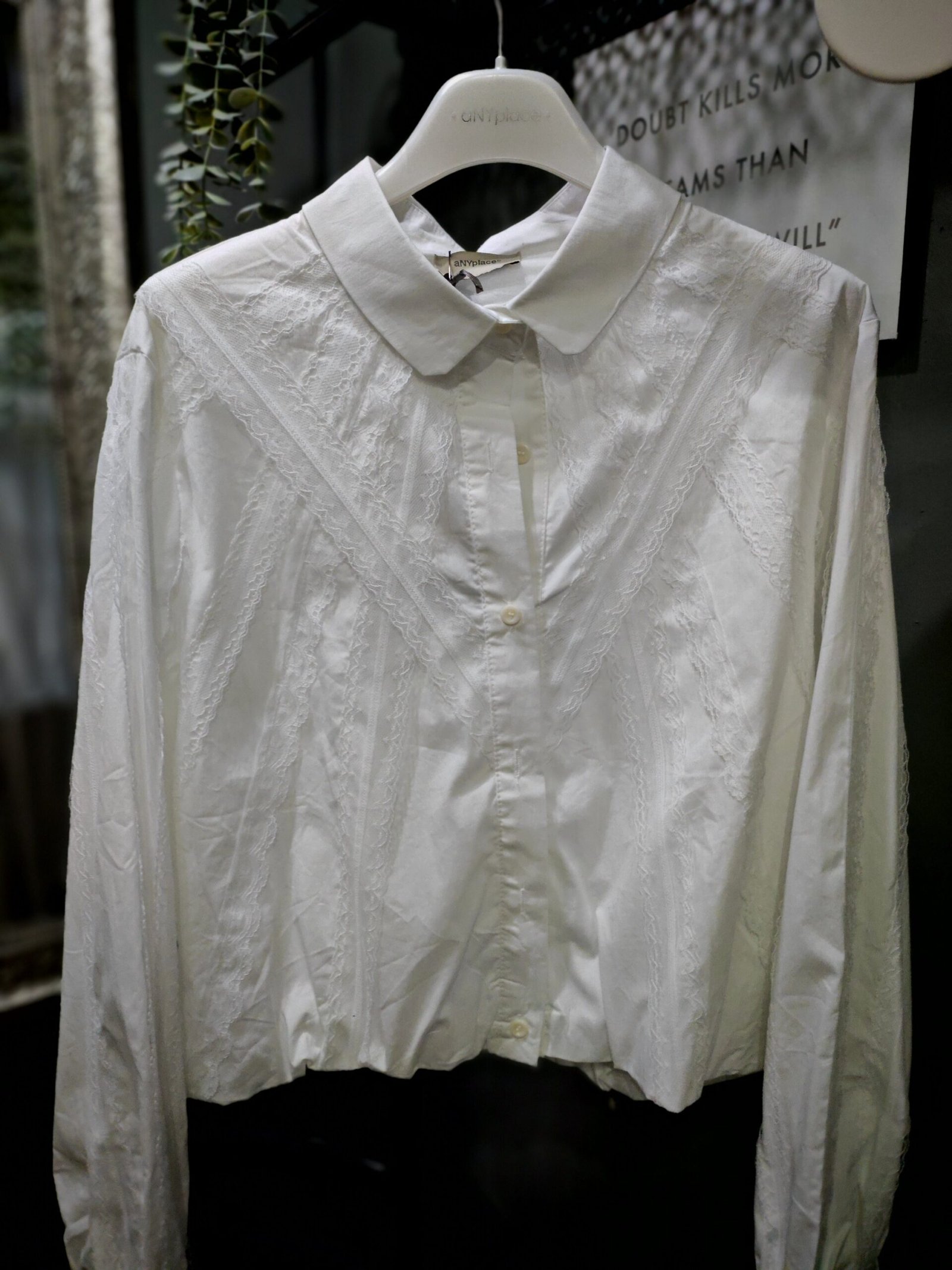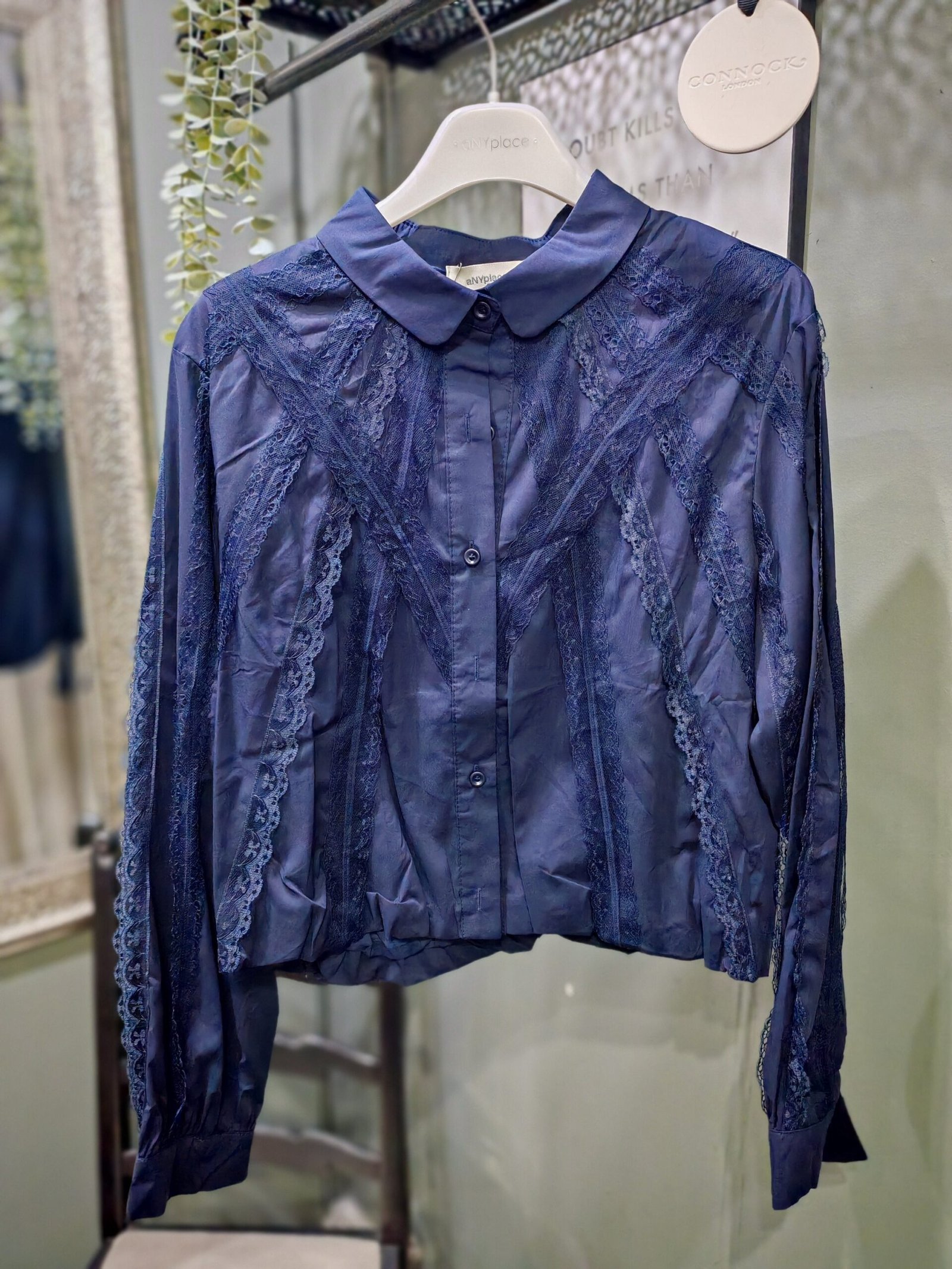 Cotton shirt with lace detail on the front and arms. Narrow cuff with button. Plain back. Small, round collar. Button through. Elasticated bottom for neat finish. Available in white and navy.
