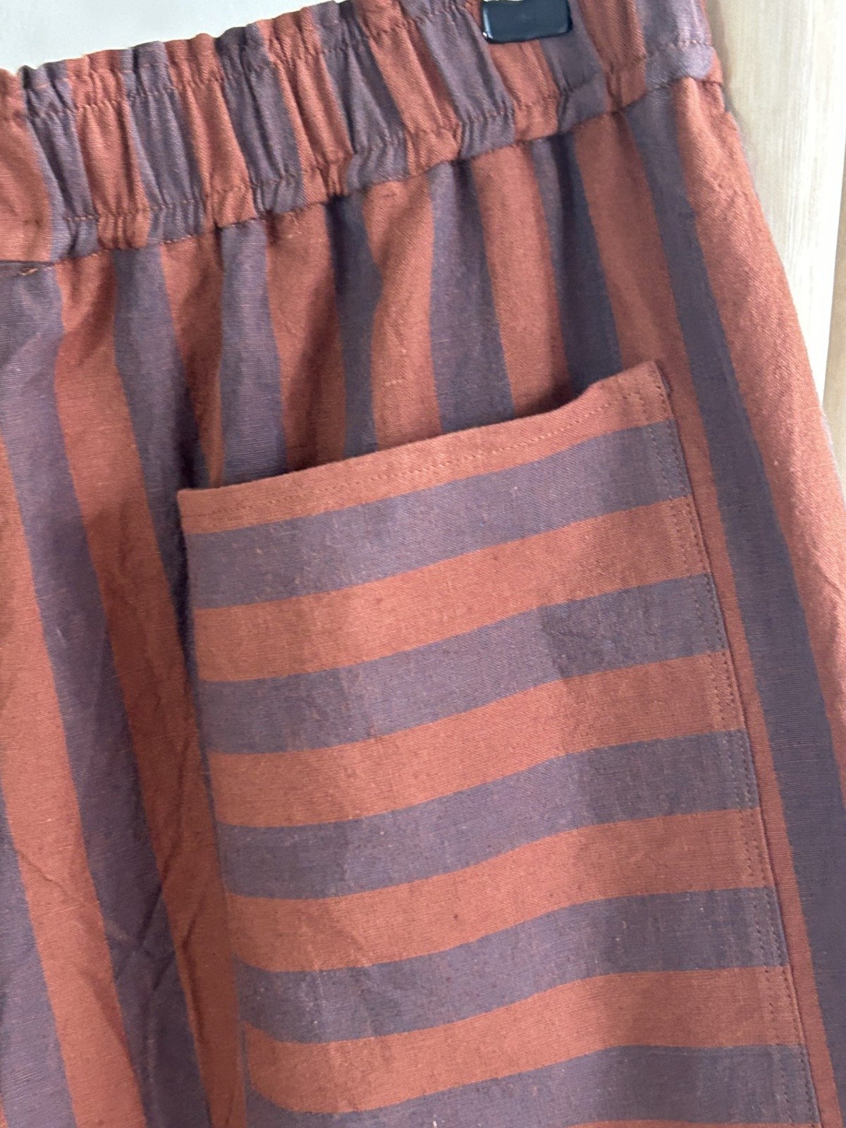 In a beautiful brown and dark blue wide stripe pure Linen, this pair of Betchworth’s have the luxury feel and look that comes with high quality linen. The coordinated back pockets provide a stylish contrast to the linear stripe.